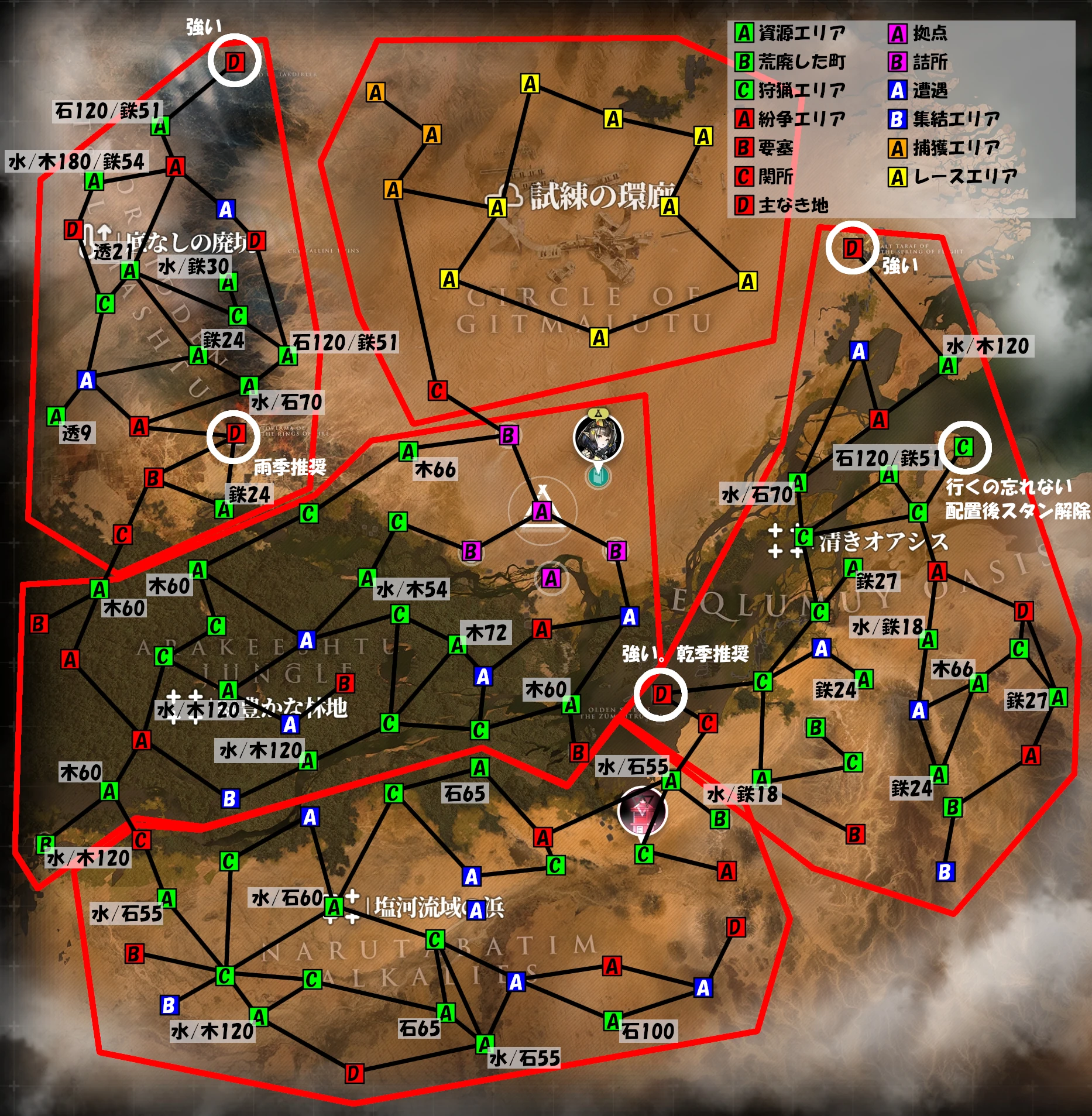 以下が生息演算「熱砂秘聞」のマップ全体です。 素材集めのために作ったという背景があるので、どこにどれくらいの素材があるかも書かれてます。
