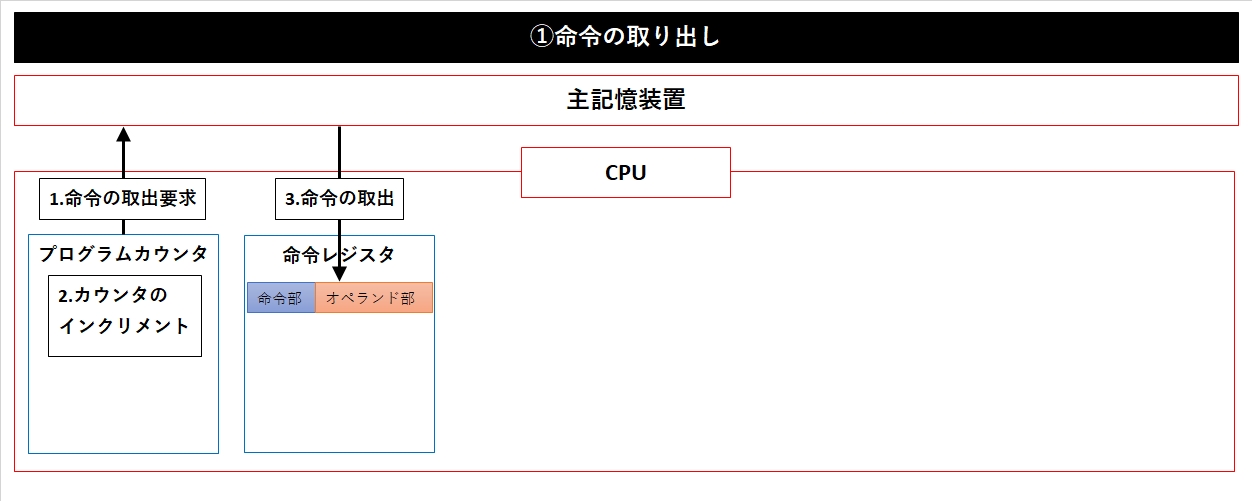 「プログラムカウンタ(命令アドレスレジスタ)」というところに「実行する命令が主記憶装置のどこにあるのか」という情報を持っているため、それを使って主記憶装置から命令を取り出す。